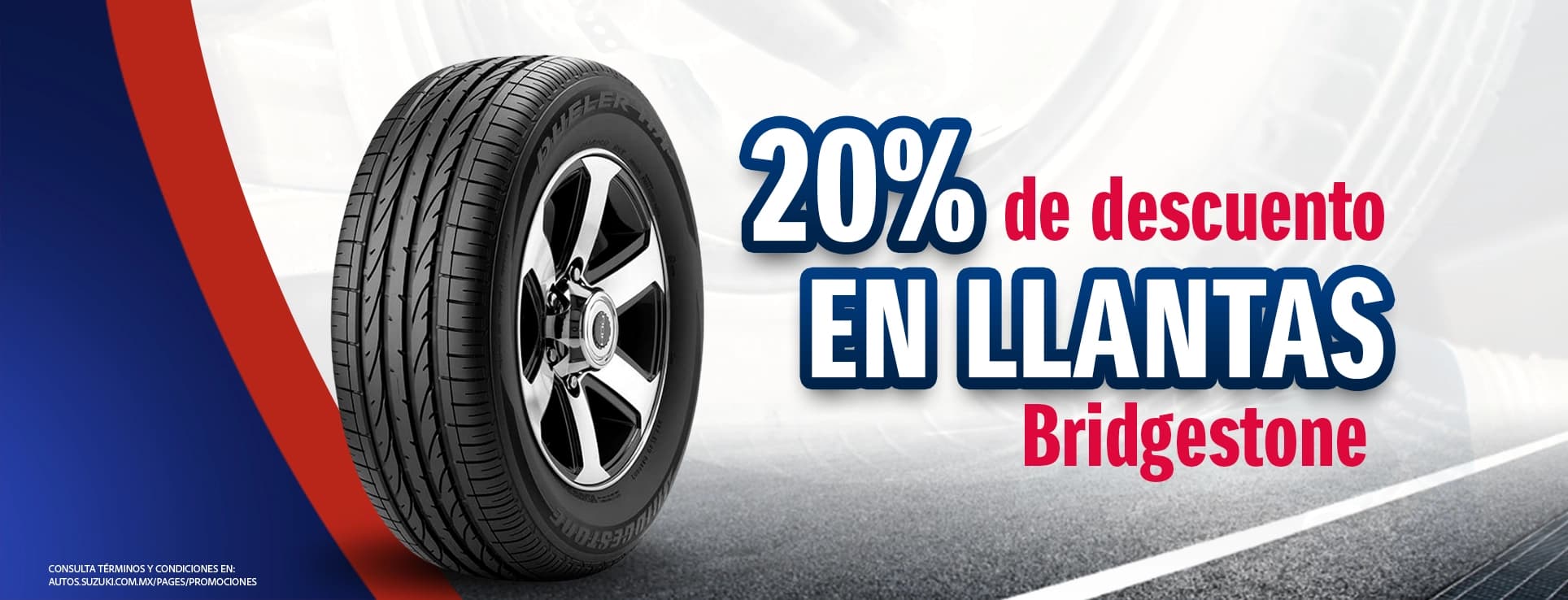Términos y condiciones: DINÁMICA DE LA PROMOCIÓN: Al adquirir alguno de los productos participantes con el concesionario autorizado de la red SUZUKI, de su elección, obten un 20% de descuento sobre el precio público del producto. ESTABLECIMIENTOS PARTICIPANTES: Todos los integrantes de la red de concesionarios autorizados de la marca SUZUKI (AUTOS). PRODUCTOS PARTICIPANTES: Promoción válida únicamente en llantas de la marca Bridgestone indicadas a continuación: 175/65R15 84H BRIDGESTONE IGNIS GA (RIN 15), 195R15 RD 613 BRIDGESTONE JIMNY 3 Y 5 PUERTAS, 195/60R16 89H BRIDGESTONE ERTIGA XL7, FRONX BOOSTERGREEN (RIN 16), 215/60R17 96H BRIDGESTONE GRAND VITARA BOOSTERGREEN (RIN 17), 185/55R16 83V BRIDGESTONE SWIFT GLS, SWIFT GLX, SWIFT GLX (RIN 16), NO APLICA SWIFT SPORT. 175/60R16 82H BRIDGESTONE IGNIS GLX (RIN 16), 185/55R16 83H FIRESTONE SWIFT GLS, SWIFT GLX, SWIFT GLX (RIN 16), NO APLICA SWIFT SPORT. 185/65R15 88H BRIDGESTONE ERTIGA (RIN 15), CIAZ (RIN15). 215/55R17 94V BRIDGESTONE NUEVA VITARA y S-CROSS (RIN 17). 195/55R16 91V BRIDGESTONE BALENO (RIN 16), CIAZ (RIN16) Nota: Para información sobre precios de llantas y costos de instalación, consultar directamente en el concesionario autorizado de la red SUZUKI de su elección. RESTRICCIONES: La promoción no incluye instalación o cualquier accesorio necesario para la misma. Productos sujetos a disponibilidad de acuerdo a los inventarios de cada uno de los concesionarios autorizados de la red SUZUKI. VIGENCIA DE LA PROMOCIÓN: 23 de marzo al 10 de abril de 2026 o hasta agotar existencias, lo que ocurra primero. Las imágenes mostradas en la publicidad solo son de carácter ilustrativo, pueden no corresponder exactamente al producto final.