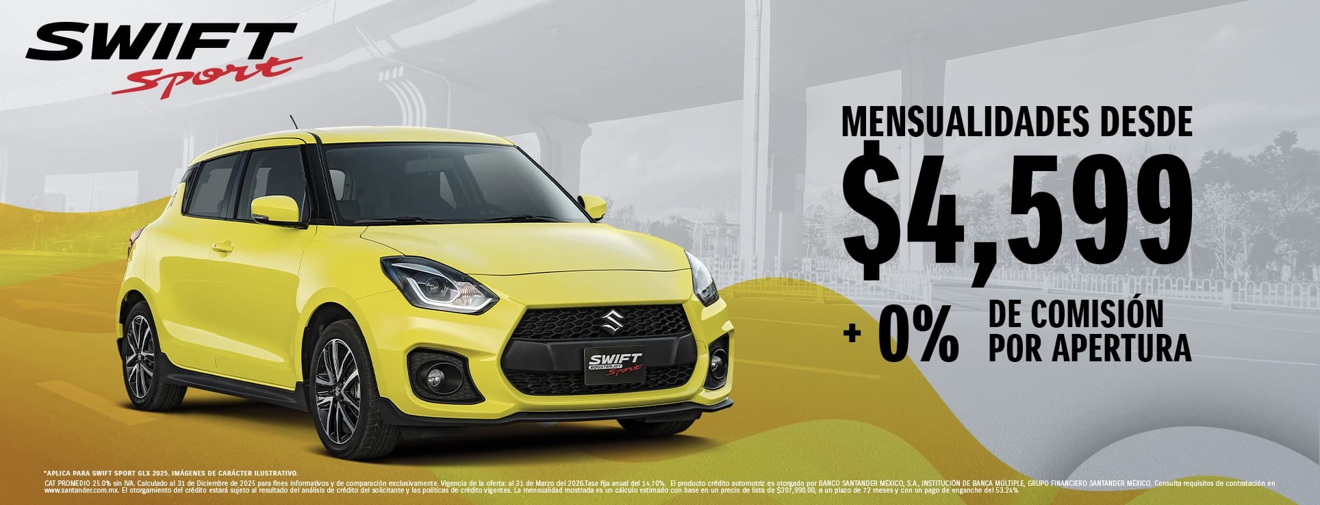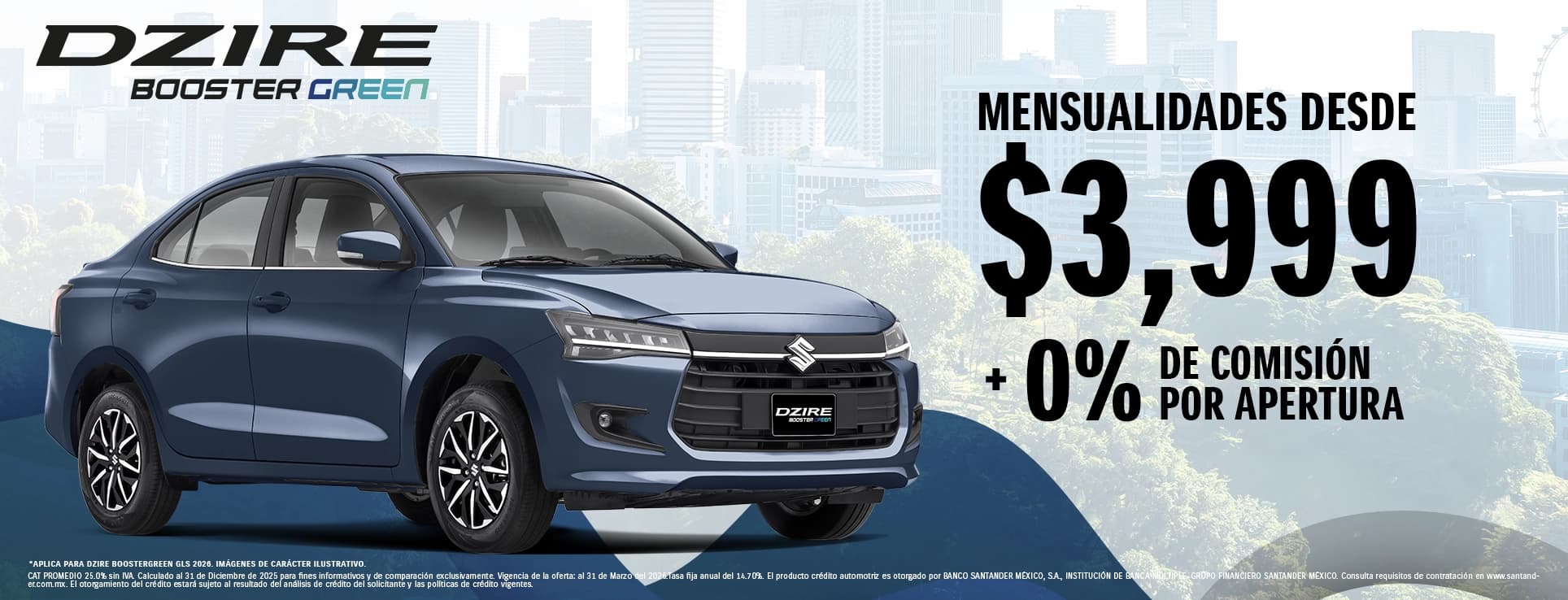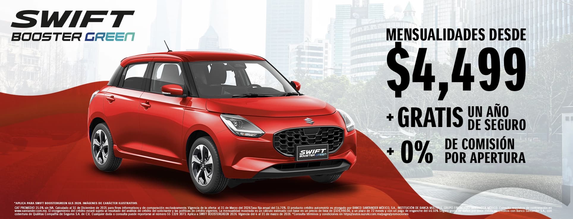 CAT PROMEDIO 25.0% sin IVA. Calculado al 31 de Diciembre de 2025 para fines informativos y de comparación exclusivamente. Vigencia de la oferta: al 31 de Marzo del 2026.Tasa fija anual del 14.70%. El producto crédito automotriz es otorgado por BANCO SANTANDER MÉXICO, S.A., INSTITUCIÓN DE BANCA MÚLTIPLE, GRUPO FINANCIERO SANTANDER MÉXICO. Consulta requisitos de contratación en www.santander.com.mx. El otorgamiento del crédito estará sujeto al resultado del análisis de crédito del solicitante y las políticas de crédito vigentes. La mensualidad mostrada es un cálculo estimado con base en un precio de lista de $339,990.00, a un plazo de 72 meses y con un pago de enganche del 46.50% Seguro gratis de daños por doce meses en créditos con Banco Santander S.A., con cobertura de Quálitas Compañía de Seguros S.A. de C.V.. Cualquier duda o consulta puede reportarse al número 55 1328 3073. Aplica a SWIFT BOOSTERGREEN 2026. Vigencia del 4 al 31 de marzo de 2026. *Consulta términos y condiciones en https://autos.suzuki.com.mx/pages/promociones