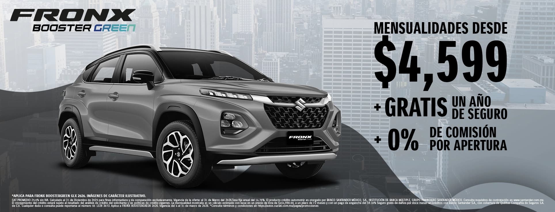 CAT PROMEDIO 25.0% sin IVA. Calculado al 31 de Diciembre de 2025 para fines informativos y de comparación exclusivamente. Vigencia de la oferta: al 31 de Marzo del 2026.Tasa fija anual del 14.70%. El producto crédito automotriz es otorgado por BANCO SANTANDER MÉXICO, S.A., INSTITUCIÓN DE BANCA MÚLTIPLE, GRUPO FINANCIERO SANTANDER MÉXICO. Consulta requisitos de contratación en www.santander.com.mx. El otorgamiento del crédito estará sujeto al resultado del análisis de crédito del solicitante y las políticas de crédito vigentes. La mensualidad mostrada es un cálculo estimado con base en un precio de lista de $339,990.00, a un plazo de 72 meses y con un pago de enganche del 46.50% Seguro gratis de daños por doce meses en créditos con Banco Santander S.A., con cobertura de Quálitas Compañía de Seguros S.A. de C.V.. Cualquier duda o consulta puede reportarse al número 55 1328 3073. Aplica a FRONX BOOSTERGREEN 2026. Vigencia del 4 al 31 de marzo de 2026. *Consulta términos y condiciones en https://autos.suzuki.com.mx/pages/promociones