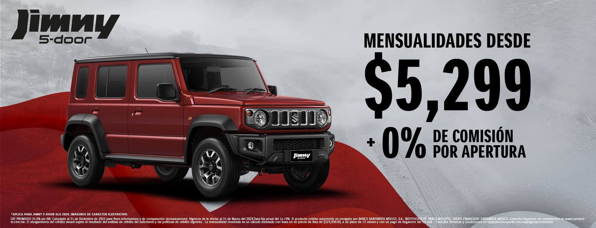 CAT PROMEDIO 25.0% sin IVA. Calculado al 31 de Diciembre de 2025 para fines informativos y de comparación exclusivamente. Vigencia de la oferta: al 31 de Marzo del 2026.Tasa fija anual del 14.70%. El producto crédito automotriz es otorgado por BANCO SANTANDER MÉXICO, S.A., INSTITUCIÓN DE BANCA MÚLTIPLE, GRUPO FINANCIERO SANTANDER MÉXICO. Consulta requisitos de contratación en www.santander.com.mx. El otorgamiento del crédito estará sujeto al resultado del análisis de crédito del solicitante y las políticas de crédito vigentes. La mensualidad mostrada es un cálculo estimado con base en un precio de lista de $529,990.00, a un plazo de 72 meses y con un pago de enganche del 59.34% *Consulta términos y condiciones en https://autos.suzuki.com.mx/pages/promociones